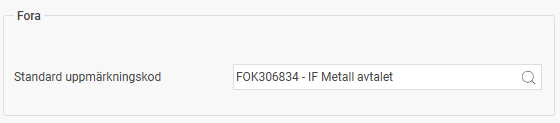 För medarbetare som tillhör Fora lägger du på personalkategorin in den standard uppmärkningskod som ska tillämpas på de anställda som tillhör kategorin.