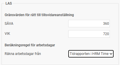 Ställ in gränsvärden för rätt till tillsvidareanställning för de olika anställningsformerna SÄVA och VIK, samt vilken beräkningsregel som ska tillämpas för arbetsdagar. Om modulen Time används räknas arbetsdagar från Tidrapporten i HRM Time. Om tidrapportering sker i ett annat försystem kan beräkningen istället göras från en löneart i HRM Payroll. Lönearten måste då läsas in från försystemet och innehålla antalet arbetsdagar som ska inkluderas i beräkningen i antalsfältet.
