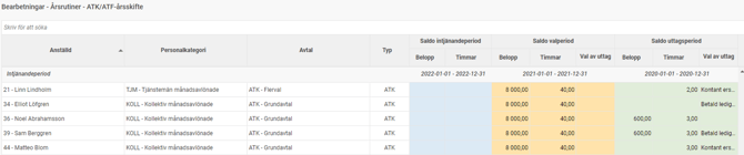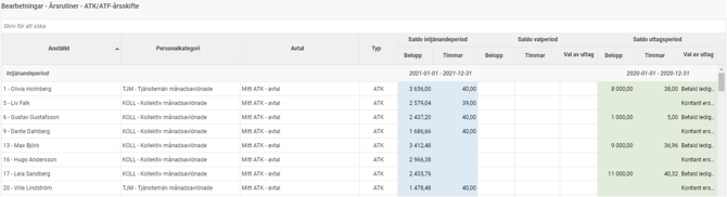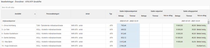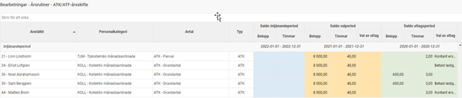- Gå till Administration > Bearbetningar > Årsrutiner > ATK/ATF-skifte. I översiktsvyn ser du de anställda som har en pågående intjänandeperiod och en uttagsperiod.