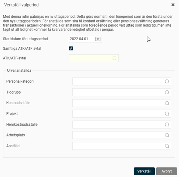 - Du kan göra urval på ett specifikt ATK/ATF-avtal eller på anställda om du vill köra rutinen för en grupp i taget.