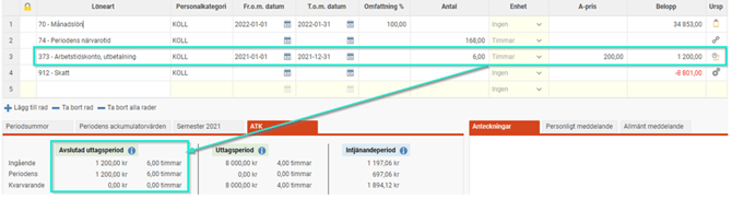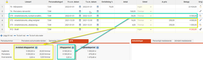 Längst ned i löneberedningen, under fliken ATK, kan du nu se både den avslutade uttagsperioden (där eventuellt kvarvarande saldo har betalats ut) och den nya uttagsperioden.