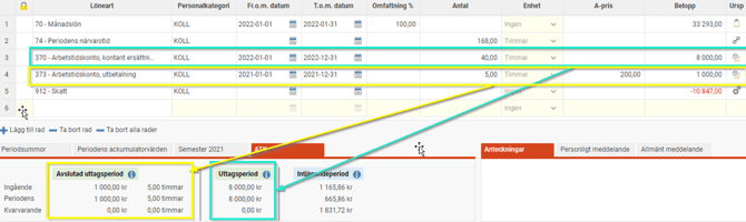 Exempel 2: En anställd har kvarvarande saldo från föregående period som betalas ut (markerat i gult). För den nya perioden har hen valt att få pengarna utbetalda (markerat i blått). Både den avslutade och den nya uttagsperioden nollställs.