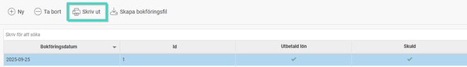 - Gå till Lön > Bokföring och välj det aktuella bokföringsunderlaget i listan. Klicka sen på Skriv ut.