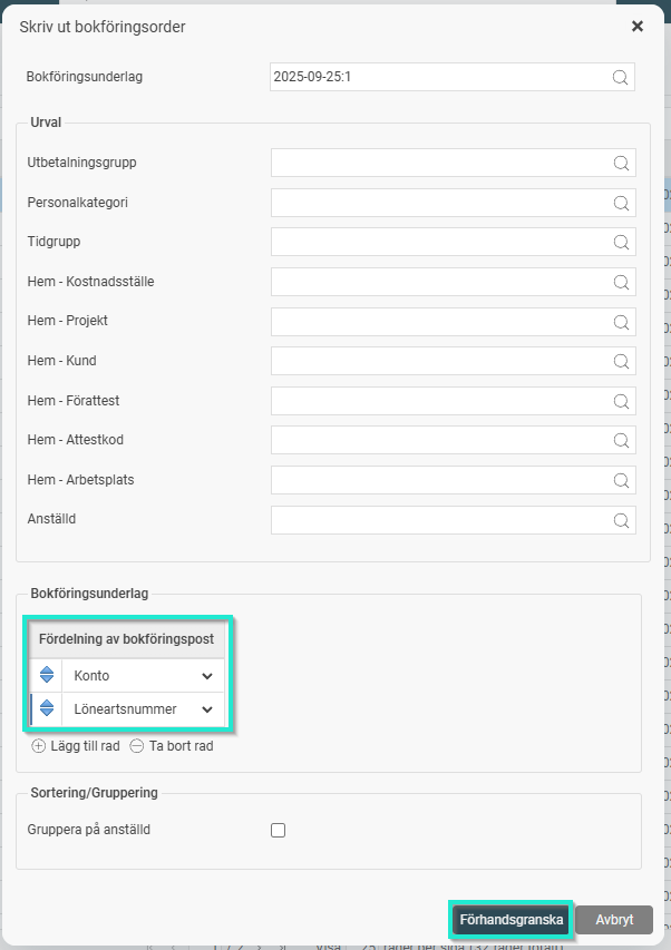 Under inställningen Fördelning bokföringspost, väljer du att visa Konto och Löneartsnummer. Klicka sen på Förhandsgranska.