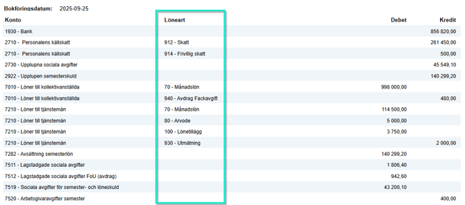 Belopp som saknar löneart bokas enligt inställningarna under Bokföring och skuldhantering (skulder, arbetsgivaravgifter, avdrag på arbetsgivaravgifter, utbetalning till bank).