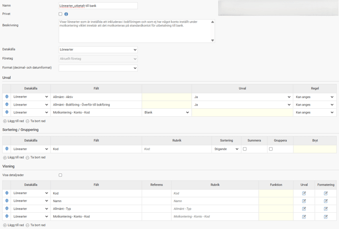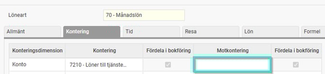 2. Gör urval på Aktiva lönearter med inställning att överföras till bokföring och blankt i fältet Motkontering - Konto - Kod.