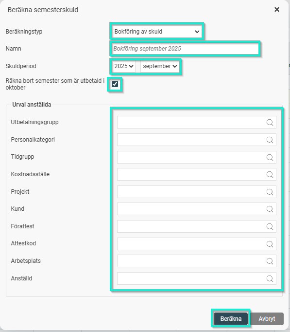 Urval: Du kan också göra kompletterande urval på exempelvis personalkategori eller konteringar om du inte vill beräkna för alla.