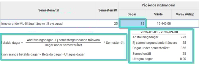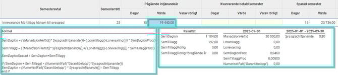 Klicka på ett specifikt värde i listan för att se formeln och de olika parametrar som ingår i uträkningen. Formeln för beräkningen av dagarnas värde kommer från semesteravtalet.