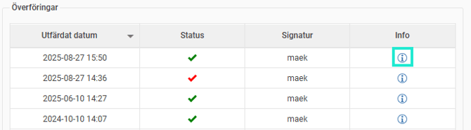 I listan under Överföringar till höger kan du se information om alla överföringar som gjorts. För att få mer information om vilka anställda som intyg skickats för samt eventuella felmeddelanden kan du klicka på i-symbolen.