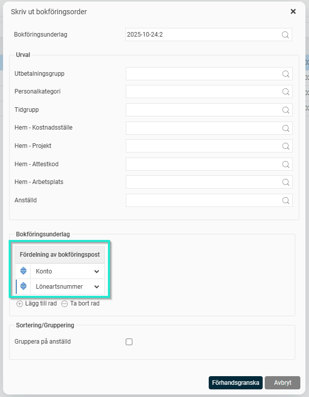 I urvalsfönstret som öppnas ändrar du inställningarna för fördelningsposten så att du endast inkluderar konto och löneart. Klicka sen på Förhandsgranska.