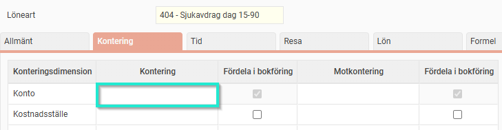 Lägg till konto direkt på lönearten Om samma konto ska användas för lönearten oavsett medarbetare, kan du lägga till det direkt i löneartens inställningar under fliken Kontering.