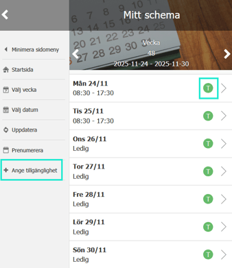 Dagar där du angett tillgänglighet markeras med ett T i Mitt schema.
