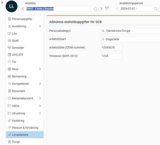 I anställdaregistret, under fliken Lönestatistik, anger du om den anställde ska räknas som Arbetare eller Övriga enligt SCB:s riktlinjer för konjunkturstatistiken. Beroende på dina övergripande inställningar ser du olika alternativ för personalkategori i anställningsregistret.