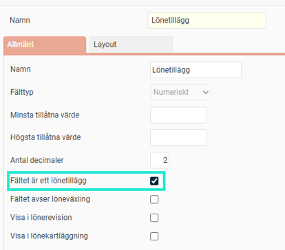 För alla fält som ska räknas som ett lönetillägg kryssar du i inställningen "Fältet är ett lönetillägg". Om du har flera fält för lönetillägg, sätter du krysset på samtliga fält.