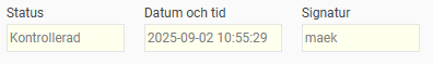 När underlaget är granskat markerar du underlaget som kontrollerat genom att klicka på knappen Markera som kontrollerad. Statusen på underlaget ändras då till Kontrollerad. Datum, tid samt signatur för användaren som markerade underlaget som kontrollerat sparas ner på underlaget.