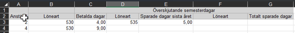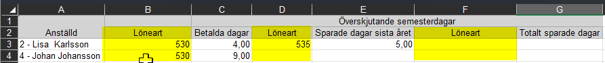 Ta bort alla kolumner förutom Anställd och de överskjutande semesterdagarna. Låt de två rubrikraderna ligga kvar.