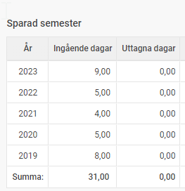 Du kan också ta ut rapporten Semestersaldon  (via Rapporter > Lön > semestersaldon) för att få en överblick på de anställdes kvarvarande semesterdagar inför semesterårsskiftet.