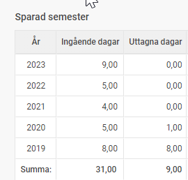 Efter utbetalning av 4 dagar som tillhör sparår 1 (= ej uttagna betalda dagar) + 5 dagar från sparår 2018 (samtliga har avräknats mot sparår 2019 och 2020) om ingen justering av saldon gjorts.