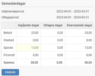Om utbetalning inte görs i den ordinarie körningen för april kommer alla dagar att flyttas över till sparade dagar, årets kvarvarande betalda dagar hamnar då på sparår 1 och när utbetalning görs i kommande lönekörning utbetalas sparade dagar från det sista sparåret i första hand, näst sista året i andra hand o.s.v. Detta innebär att du då kan behöva justera saldona för sparade dagar innan eller efter utbetalning gjorts för att få rätt fördelning på de olika sparåren.