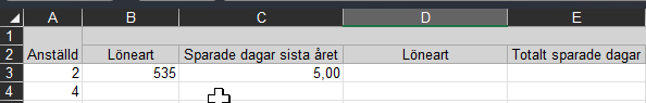 Alternativt kan du skapa en fil där du på nya rader flyttar ner Sparade dagar sista året och Totalt sparade dagar och lägger till anställningsnummer och rätt löneart. Då behöver du bara läsa in filen en gång.