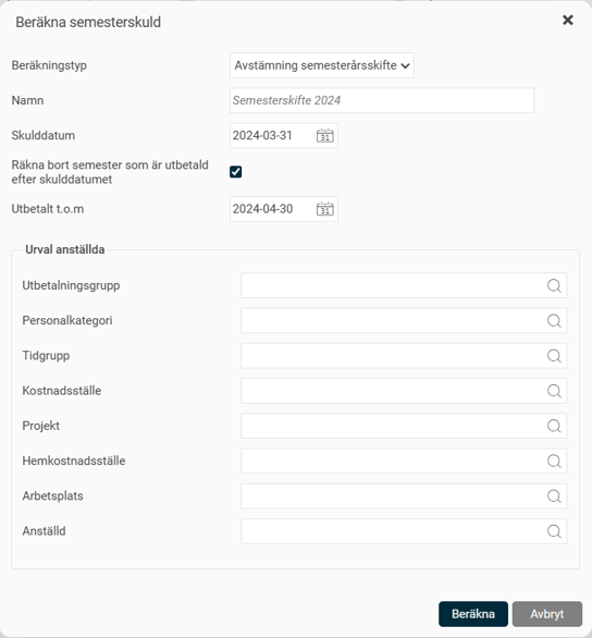 5. Om semesterårsskiftet ska göras i en extra lönekörning avräknar du nu den ordinarie lönekörningen. Därefter skapar du en extra lönekörning där du tar med samtliga anställda men inga transaktioner. (Om semesterårsskiftet görs i den ordinarie lönekörningen ska lönen ej avräknas, fortsätt enligt steg 6).