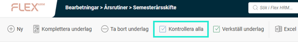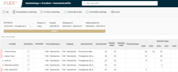 När du har gått igenom underlaget klickar du på Kontrollera alla, eller kryssa i en anställd åt gången som kontrollerad direkt i listan. Kontrollmarkeringen går att ta bort om det är något du vill justera så länge semesterskiftet inte har verkställts.
