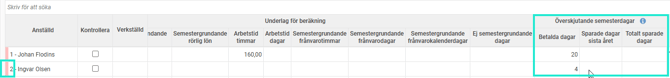 Du får då fram ett underlag som du kan kontrollera. Om du klickar på Värde eller fältet Dagar på respektive anställd får du fram information om hur beräkningen är gjord.