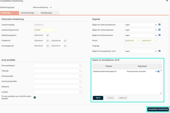 OBS! Om du betalat ut överskjutande semesterdagar är det viktigt att du uppdaterar underlaget för semesterskifte genom att komplettera underlaget. Det är viktigt för att antal semesterdagar som betalats ut ska räknas ner, och den anställde inte ska få för många dagar vid verkställandet. Du kan göra detta på alla anställda eller bara de som du betalat ut för genom att göra urval vid komplettering.