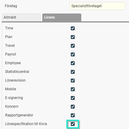Denna inställning måste vara ikryssad för att det ska vara möjligt att skicka lönespecifikationer till Kivra.