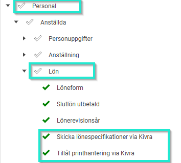För att få åtkomst att aktivera inställningen i anställdaregistret  behöver följande behörigheter vara aktiverade på rollen. Under Personal > Lön aktiveras Skicka lönespecifikationer via Kivra samt Tillåt printhantering via Kivra om den tilläggstjänsten är aktuell.