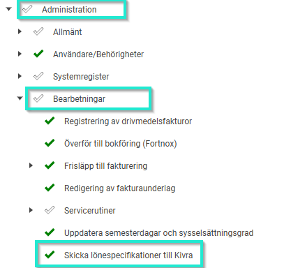 För att få åtkomst till funktionen för att skicka lönespecarna behöver rollen ha följande behörigheter aktiverade. Under Administration > Bearbetningar aktiveras Skicka lönespecifikationer till Kivra.