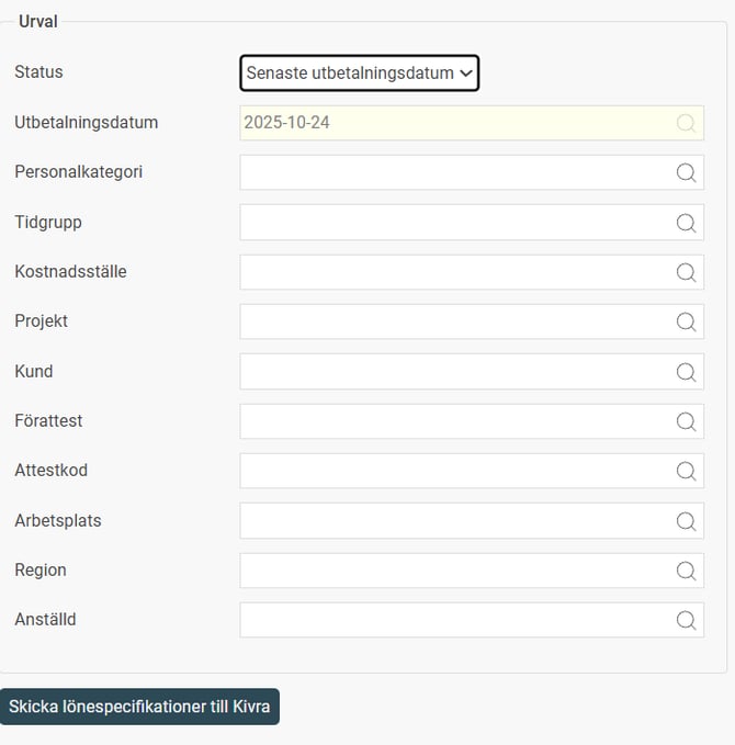 När du har gjort ditt urval klickar du på knappen Skicka lönespecifikationer till Kivra.