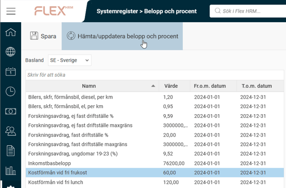 Varje år beslutar Skatteverket om olika belopp och procentsatser. Nya värden hämtas från Flex Applications webbtjänst Flex Online.