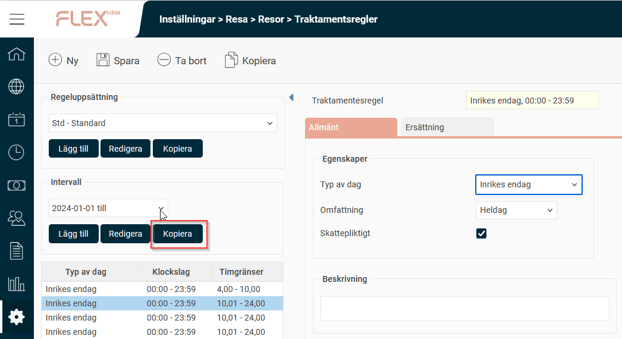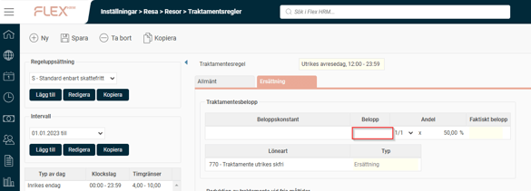 Om du däremot vill göra förändringar på traktamentsregler eller ändra till exempel fasta belopp på skattepliktiga traktamentsregler behöver du skapa ett nytt regel-intervall för att kunna styra beloppen utifrån resans datum.