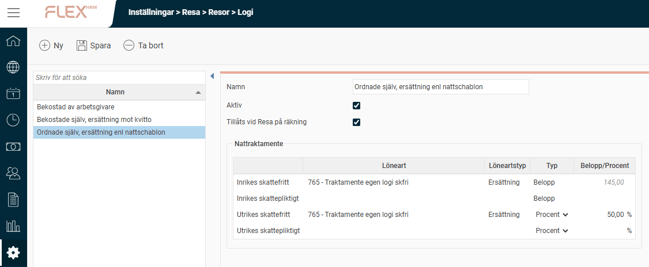 Under Logginställningar kan du kontrollera vilka loggar som är aktiverade samt aktivera nya loggar. Genom att aktivera loggning för belopp och procent samt utrikestraktamenten kan du se alla ändringar som gjorts i loggvyn.