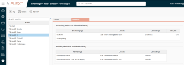 Skattepliktiga milersättningar - Fordonstyper, fliken Lönearter