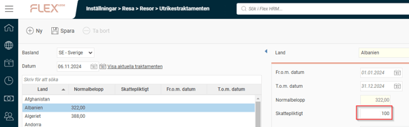 Normalbelopp för utrikestraktamenten hämtas automatiskt till Flex HRM. Du behöver alltså inte göra en manuell hämtning vid årsskiftet. Möjligheten att hämta värden manuellt finns fortfarande kvar och kan användas vid behov. Värden hämtas för samtliga länder allteftersom de finns tillgängliga. Observera att tillgängligheten beror på när respektive lands myndigheter publicerar värden för det nya året.