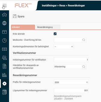Om du anger t.ex. yyyy som prefix och 001 som löpnummer kommer nya reseräkningar under 2026 få reseräkningsnummer från 2026001 till 2026999.