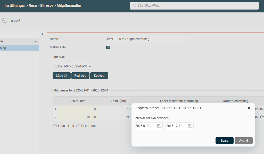 Kontrollera under Intervall om det finns regler för det nya året. Om regler för kommande år saknas kan du välja att kopiera intervallet för innevarande år. Flex HRM föreslår att intervallet ska kopieras till nästkommande år. När du klickar på OK kopieras samtliga regler i vald mall till det nya intervallet.