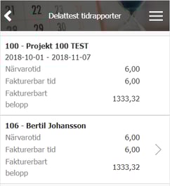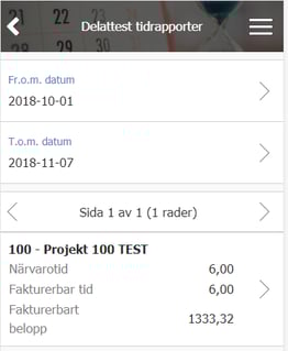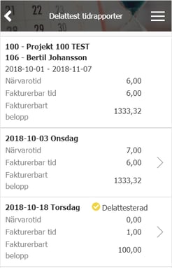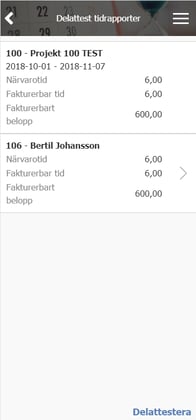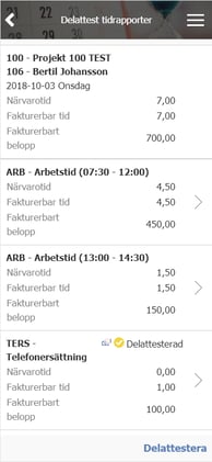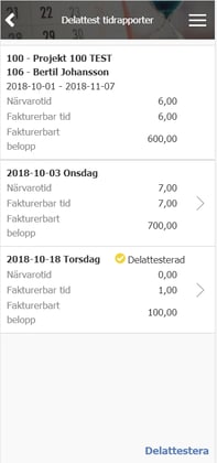 Klickar du på Delattestering tidrapporter kommer du till en översiktsvy där varje projekts timmar visas summerat per projekt. Endast klarmarkerade tider inom det valda datumintervallet kommer att visas.