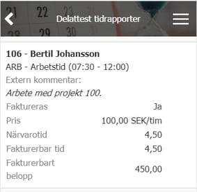 Nu kan du klicka dig ytterligare vidare för detaljer kring varje anställd. Vi klickar på Bertil i exemplet och får fram vilka dagar som han har rapporterat tid i projektet. Överst gäller summeringen nu för den anställde vi valde, Bertil i detta fall.