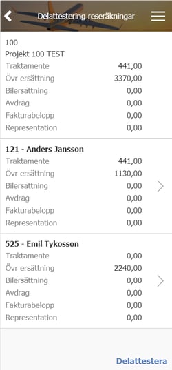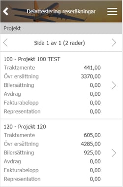 Klickar du på Delattestering reseräkningar kommer du till en översiktsvy där varje projekts timmar visas summerat per projekt. Endast klarmarkerade tider inom det valda datumintervallet kommer att visas.