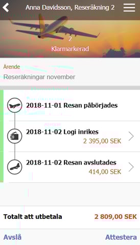 Klicka på en av raderna för att se alla detaljer kring reseräkningen, inklusive kopplade bilagor och för att attestera eller avslå.