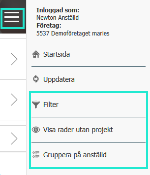 I detta läge kan du under meny-knappen filtrera de poster du vill se och/eller gruppera vyn per anställd istället för per projekt.