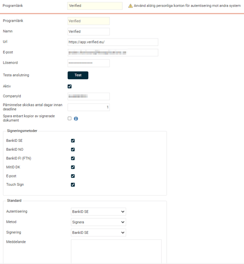 - Ange vilka standardvärden som ska synas varje gång du ska skicka dokument för signering. Dessa går att ändra för varje signering dvs. standardvärden är bara ett förslag.