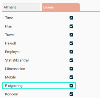För att aktivera funktionen för e-signering måste du först aktivera licensen E-signering i HRM. Under Administration – Allmänt – Företag ser du att ditt företag har licensen: