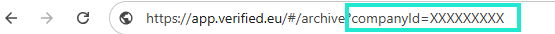 - Du behöver ange ett CompanyId för att dokumenten ska komma till rätt företag i Verified. När du loggat in i Verified hittar du detta id i url:en efter likhetstecknet. Har du fler företag upplagda i Verified hittar du dem där under menyn Grupp. Lägg då respektive CompanyId i motsvarande företags programlänk i HRM.