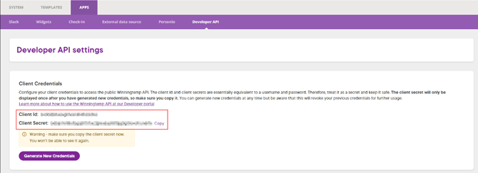 - Kopiera Client id och Client Secret som ska klistras in i HRMs programlänk för Winningtemp (se nästa avsnitt):
