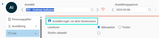 - För att uppmärksamma att en anställd ingår i en aktiv lönerevision, d.v.s. där den anställdes nya lön inte blivit verkställd, visas nedan information i sidomenyn Lön i anställdaregistret