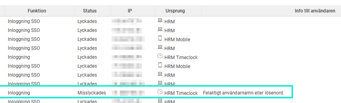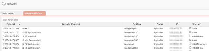 Under fliken Inloggningshistorik ser du alla inloggningsförsök, både lyckade och misslyckade.
